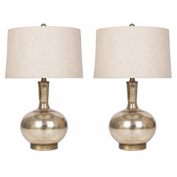 Set includes 2 table lamps. Karena gold mercury glass petite table lamp $49.99. Antiqued gold mercury glass pillar candle holder set of 3. Mercury glass table lamp set of 2 | 19 antique lamp for bedroom, living room, office, college dorm, coffee table, bookcase. Gold glass base has a finish similar to mercury glass and the beige faux linen shade complements any decor.